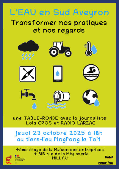 L’eau : Préoccupations, usages, enjeux – Réunion publiqueSamedi 22 mars à Pingpong le Toit à Millau à 14h30. Radio Larzac lance une résidence journalistique pour documenter les usages de l’eau